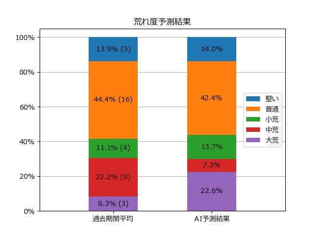 ※【 】内の数値が高いほど、AIが「買い時」と判断した買い目です。📊 荒れ度予想(単勝ベース) レースの波乱度を単勝配当の想定レンジで表示しています。