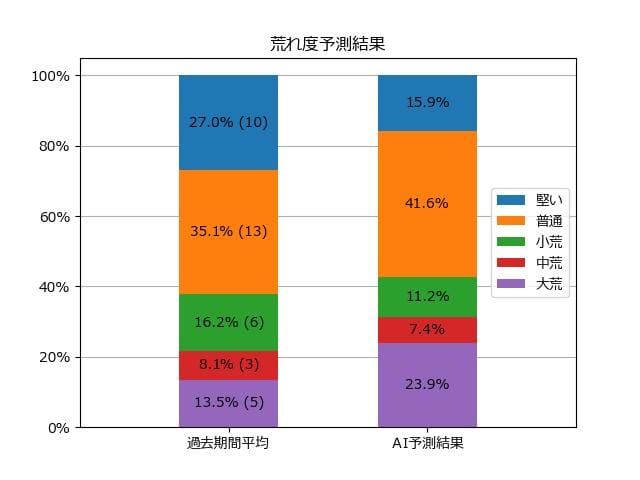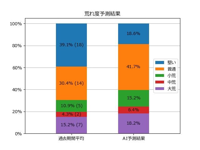 ※【 】内の数値が高いほど、AIが「買い時」と判断した買い目です。📊 荒れ度予想(単勝ベース) レースの波乱度を単勝配当の想定レンジで表示しています。