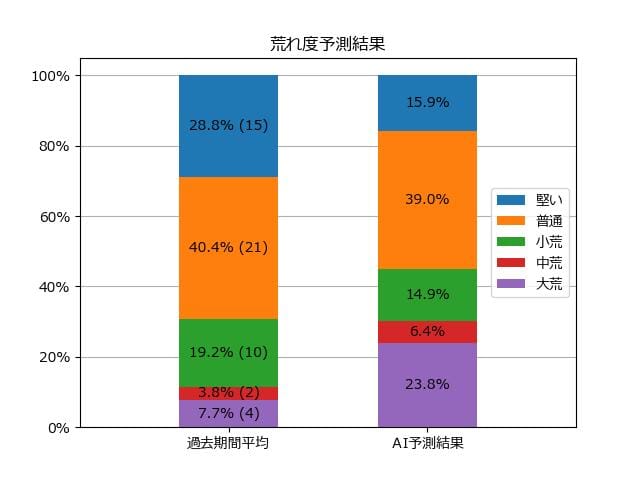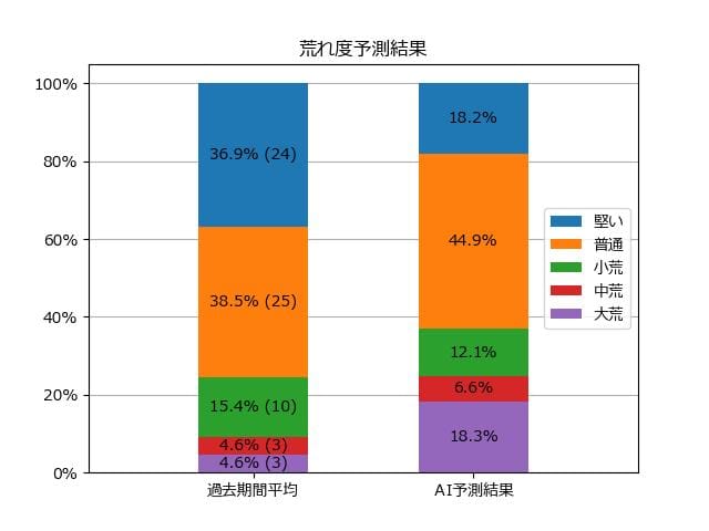 ※【 】内の数値が高いほど、AIが「買い時」と判断した買い目です。📊 荒れ度予想(単勝ベース) レースの波乱度を単勝配当の想定レンジで表示しています。