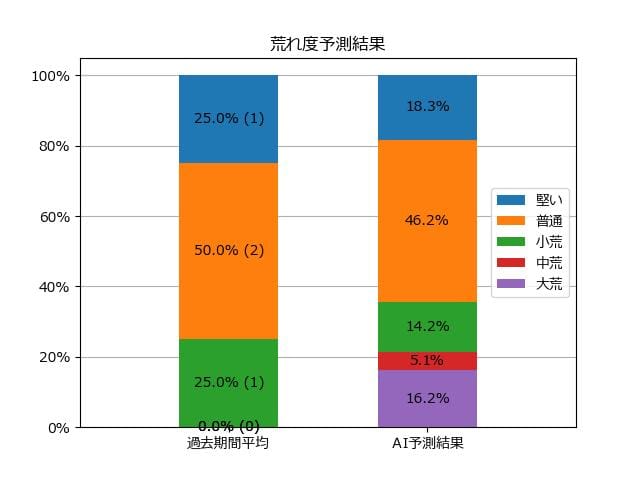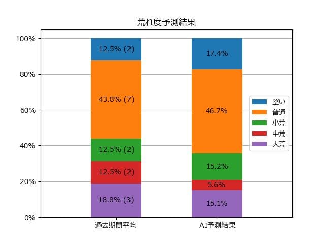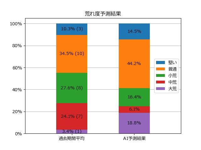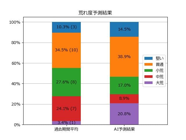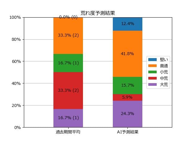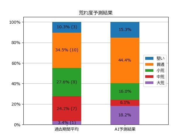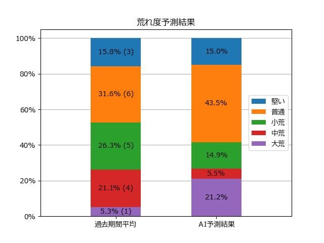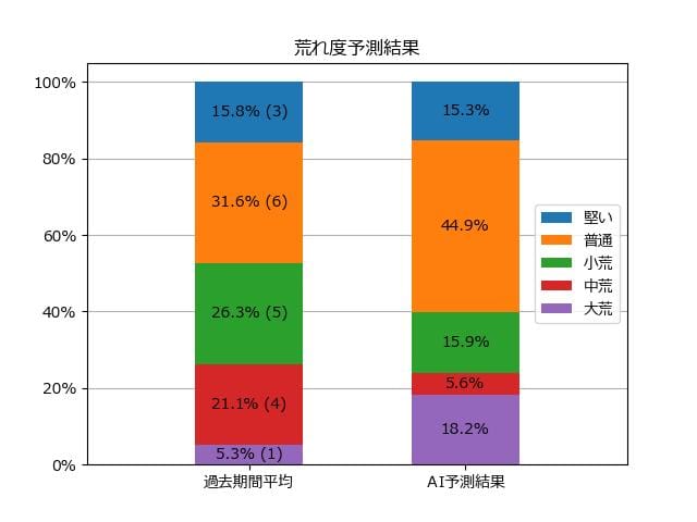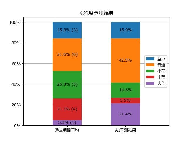 ※【 】内の数値が高いほど、AIが「買い時」と判断した買い目です。📊 荒れ度予想(単勝ベース) レースの波乱度を単勝配当の想定レンジで表示しています。