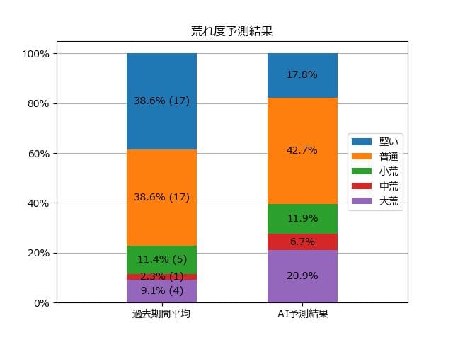 ※【 】内の数値が高いほど、AIが「買い時」と判断した買い目です。📊 荒れ度予想(単勝ベース) レースの波乱度を単勝配当の想定レンジで表示しています。