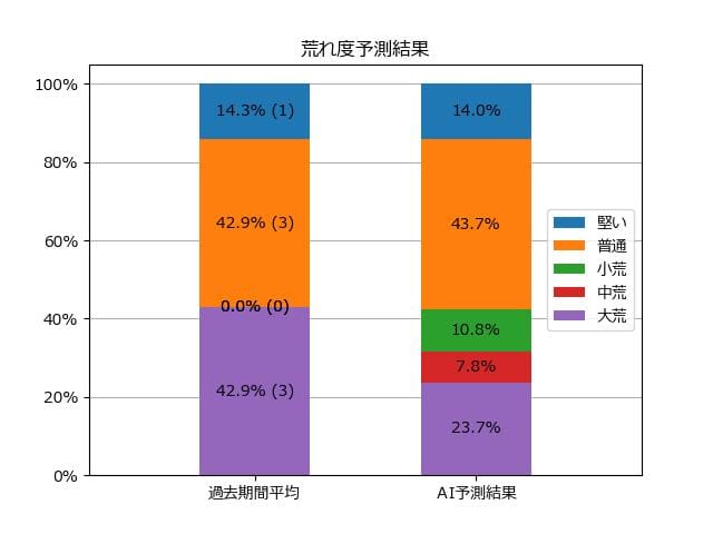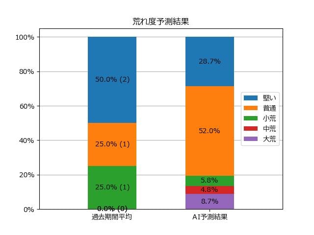 堅い:〜300 普通:〜1,000 小荒:〜3,000 中荒:〜5,000 大荒:5,100〜