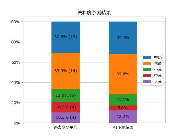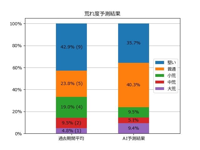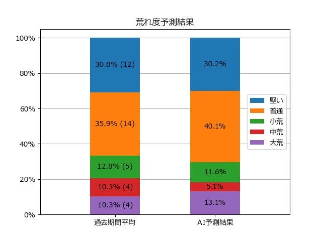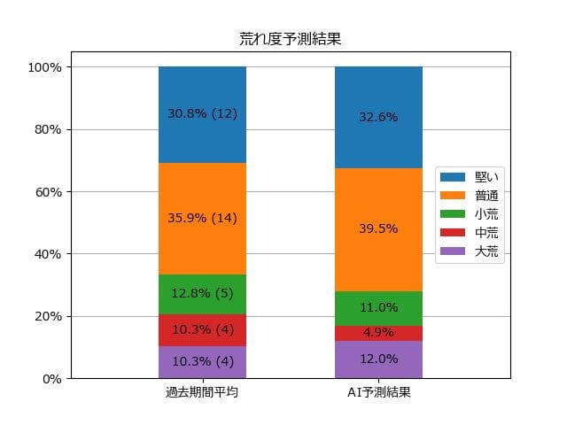 ※【 】内の数値が高いほど、AIが「買い時」と判断した買い目です。📊 荒れ度予想(単勝ベース) レースの波乱度を単勝配当の想定レンジで表示しています。