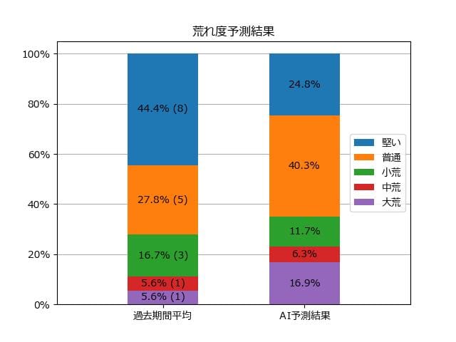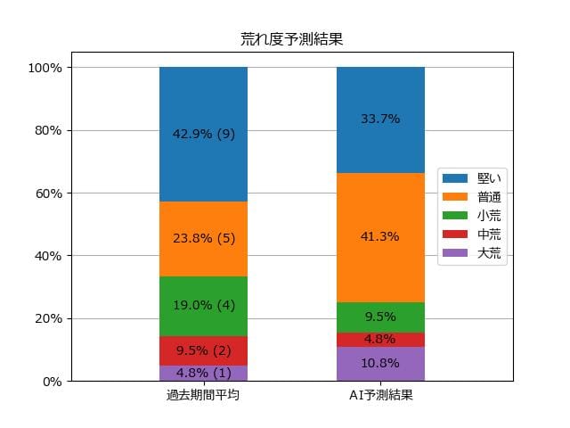 堅い:〜300 普通:〜1,000 小荒:〜3,000 中荒:〜5,000 大荒:5,100〜