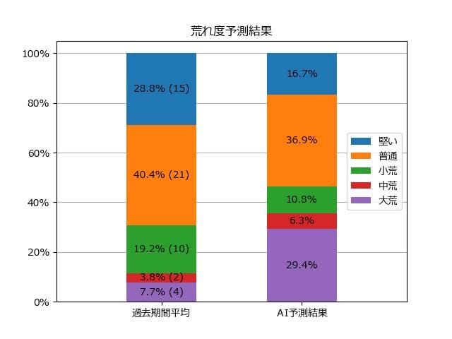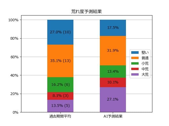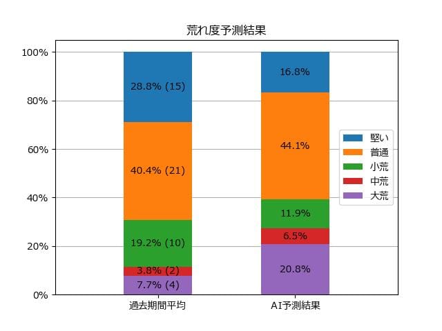 ※【 】内の数値が高いほど、AIが「買い時」と判断した買い目です。📊 荒れ度予想(単勝ベース) レースの波乱度を単勝配当の想定レンジで表示しています。