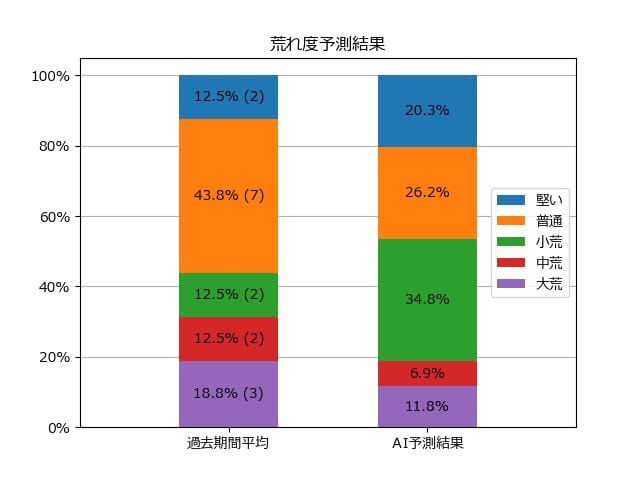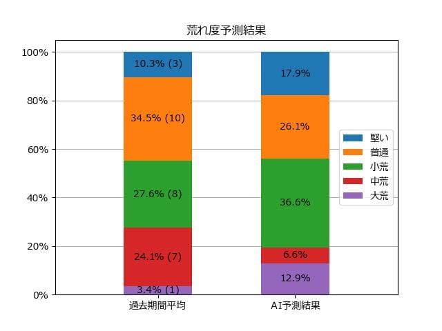 ※【 】内の数値が高いほど、AIが「買い時」と判断した買い目です。📊 荒れ度予想(単勝ベース) レースの波乱度を単勝配当の想定レンジで表示しています。