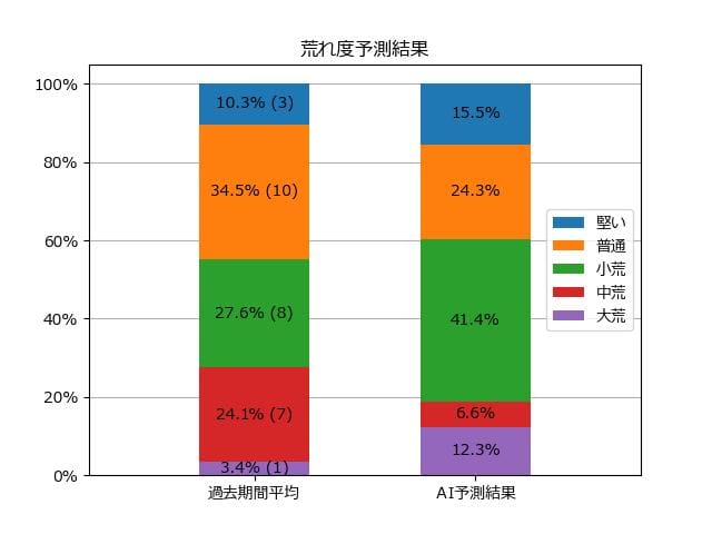 ※【 】内の数値が高いほど、AIが「買い時」と判断した買い目です。📊 荒れ度予想(単勝ベース) レースの波乱度を単勝配当の想定レンジで表示しています。