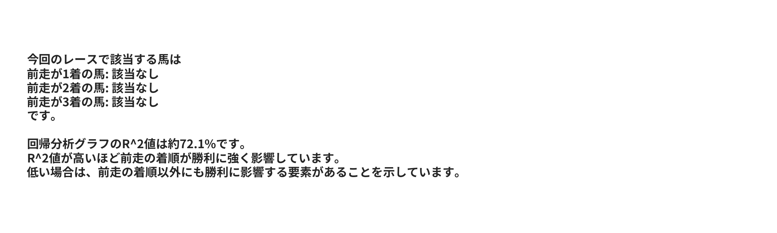 | 勝率予測印 | 勝率 | 連帯率 | 複勝率 | 枠 | 馬番 | 馬名 | 騎手名 |